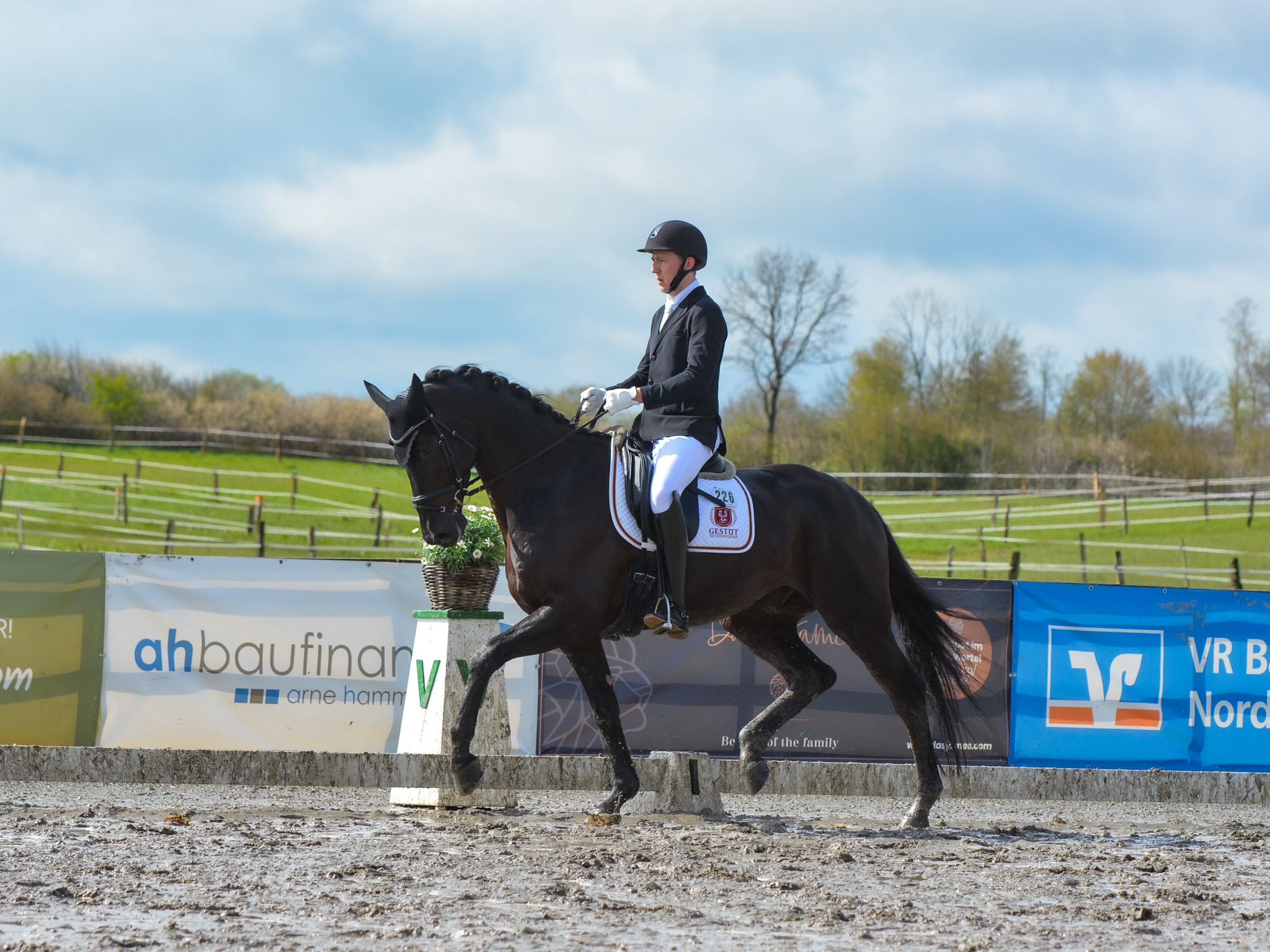 Zu den Nachwuchsspitzen aus Brodersdorf gehört auch der imposante sechsjährige Kashmir (v. Kaiser Milton) aus dem Besitz von Lena Thoenies, Hanstedt. Trotz seiner Spätreife war er mit Moritz aufgrund seiner Leichtfüßigkeit 2025 schon siegreich und platziert in Dressurpferdeprüfungen der Klasse M.