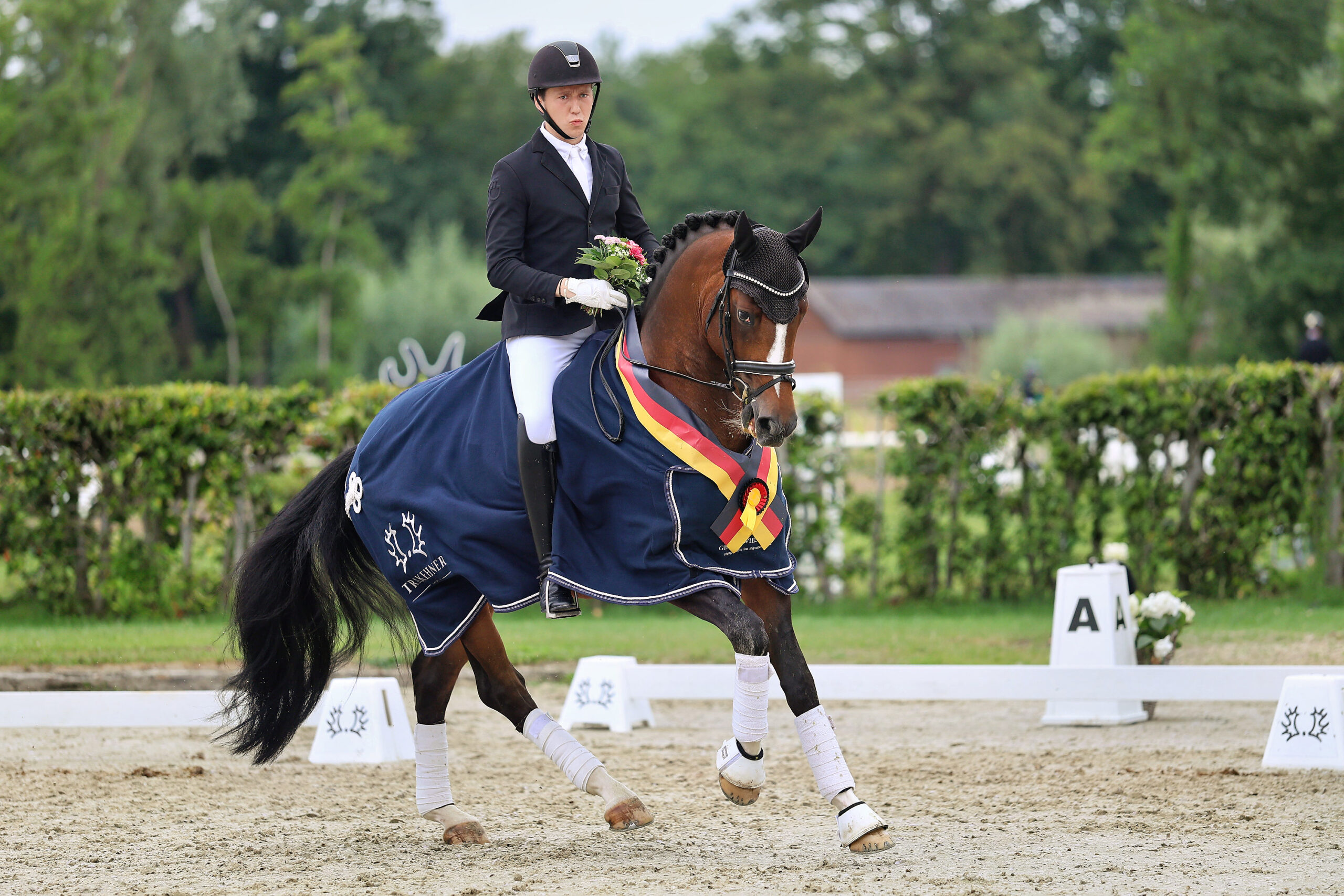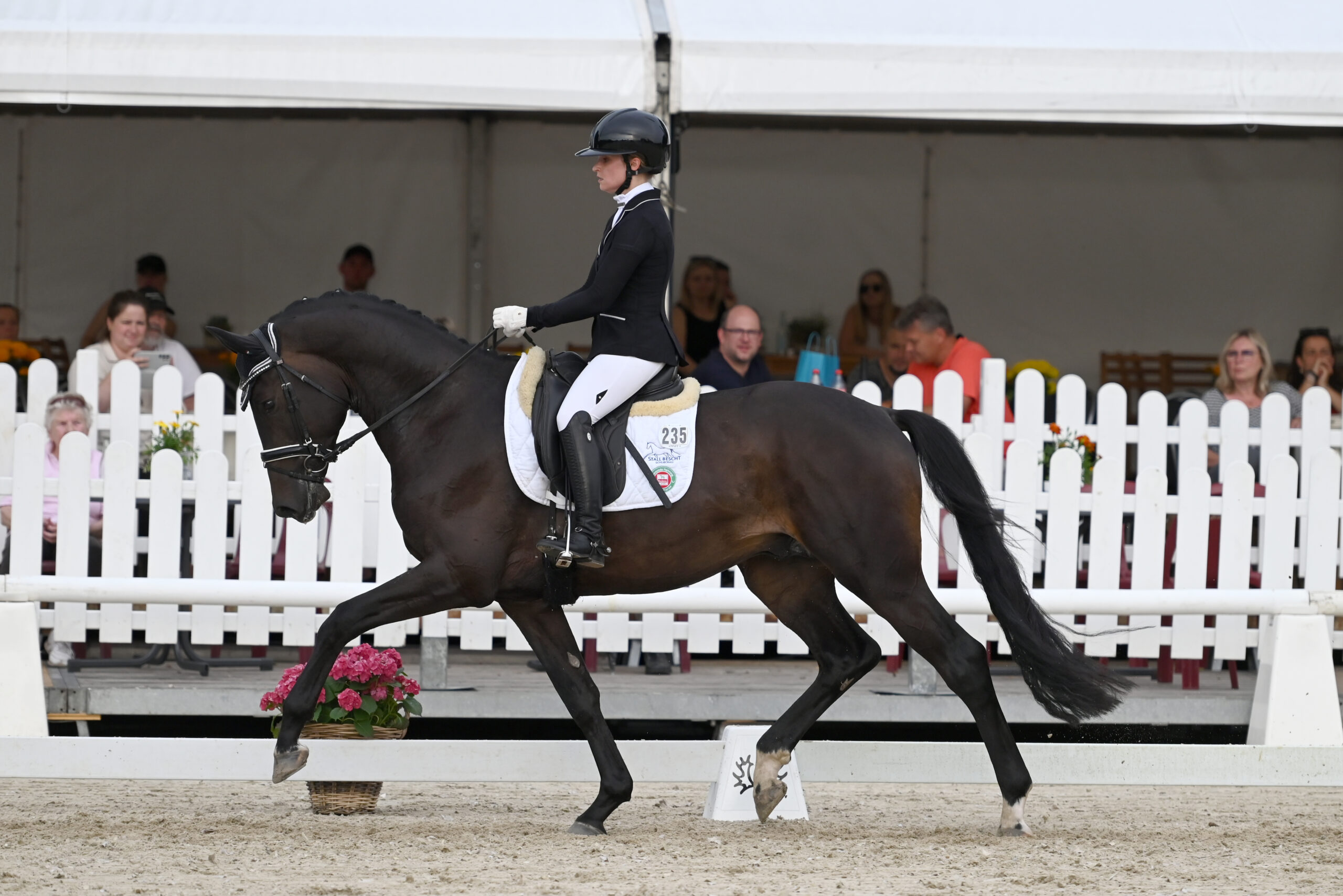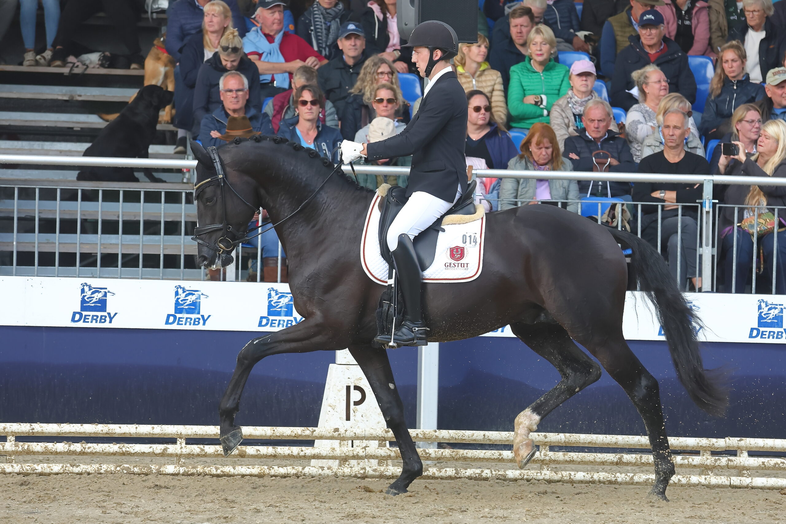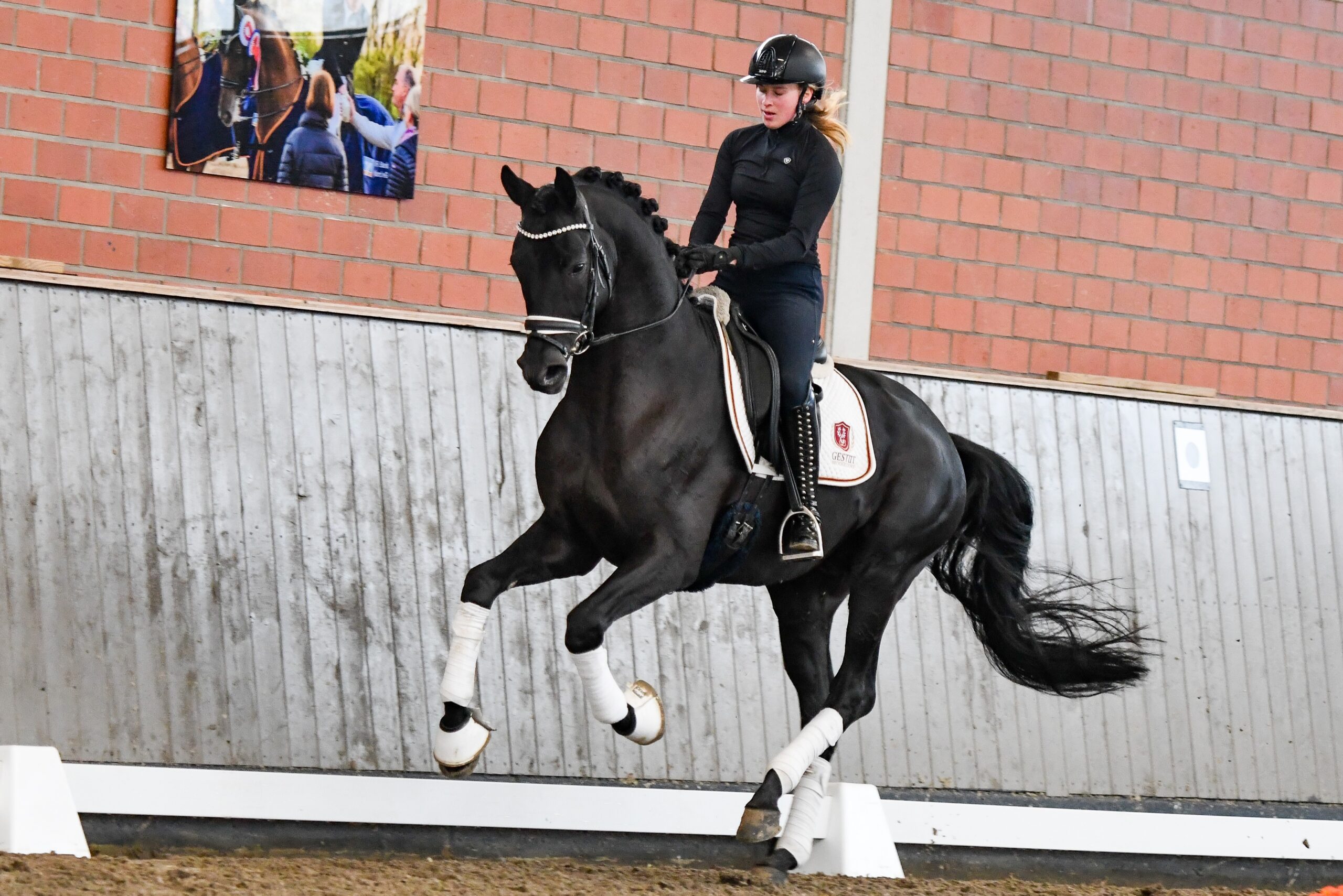 Sehr modern aufgemachter Rappe mit herrschaftlichem Auftreten und ganz bedeutender Erscheinung. Dabei steht er mit viel Bein über viel Boden. Mit seiner beachtlichen Schulterpartie und seiner guten Sattellage hebt er sich bei kraftvoller Antrittsstärke aus dem Widerrist und macht sich dabei groß und erhaben. Seine bergauf getragenen Bewegungen vermitteln auch unter dem Sattel ein imposantes Bild. Aufgrund seiner Veranlagung für versammelte Lektionen und seiner enormen Ausstrahlung verfügt er über große Perspektiven auf dem großen Viereck. New Boy steht züchterisch über den Einsatz von Tiefgefriersperma zur Verfügung.
