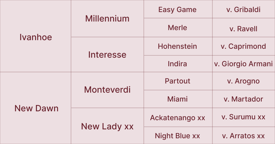 Die ganz hoch bonitierte und mehrfach ausgezeichnete Halbblut-Mutter New Dawn trägt unter anderem den Titel der amtierenden Landessiegerin des Zuchtbezirks Westfalen. Sie ist eine Tochter des Siegerhengstes Monteverdi und kann auf einen sehr prominenten Vollblutstamm verweisen. Sie ist eine Enkelin der Fährhofer Rennbahnlegende Acatenango xx und zudem eine mütterliche Halbschwester der Vererber New Wonder xx und New Moon xx.
